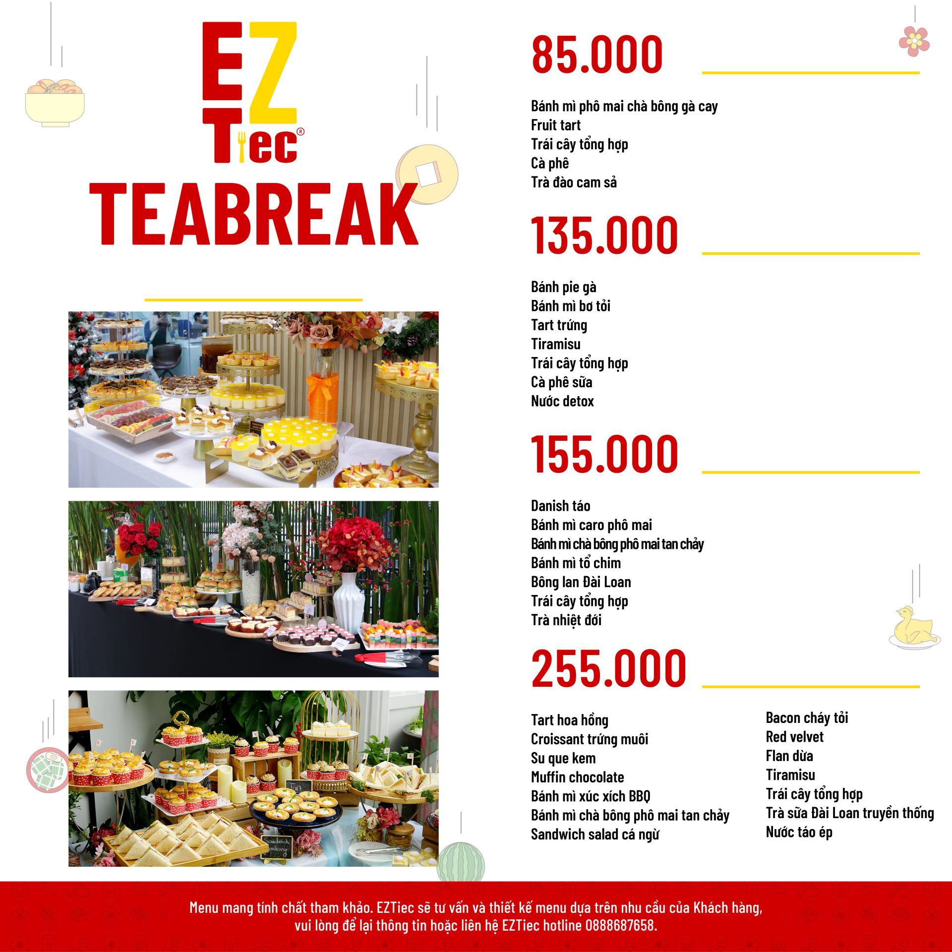 Trong mạng lưới EZTiec, các Đối tác có thể phục vụ tận nơi các loại hình: tiệc bàn truyền thống, tiệc buffet, tiệc teabreak, finger food,...